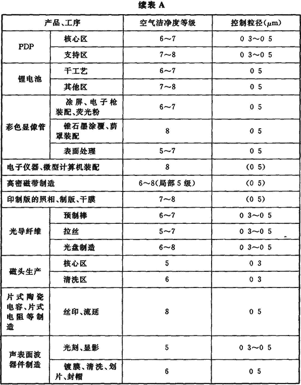 附錄A 各類(lèi)電子產(chǎn)品生產(chǎn)對空氣潔凈度等級的要求